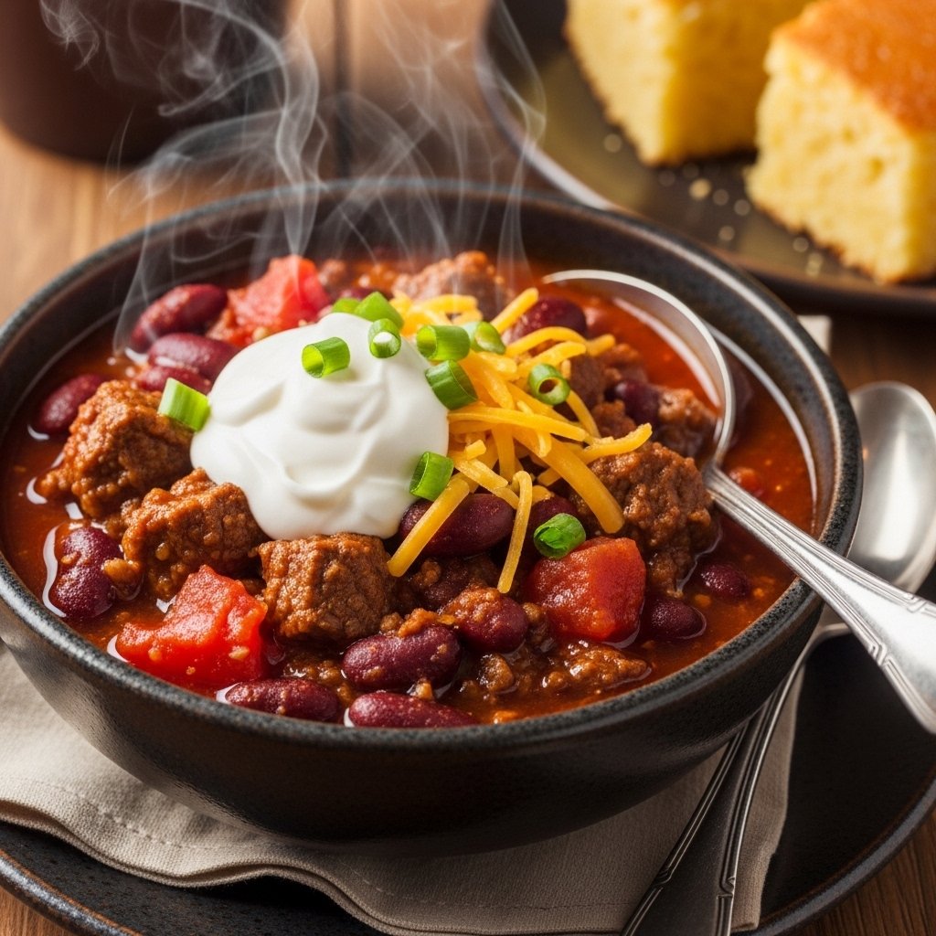 Serve the chili in bowls with cornbread on the side. The sweetness of the cornbread balances the chili’s savory heat.